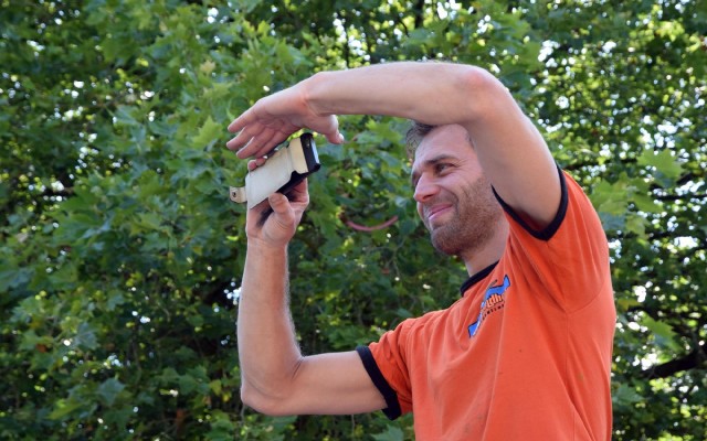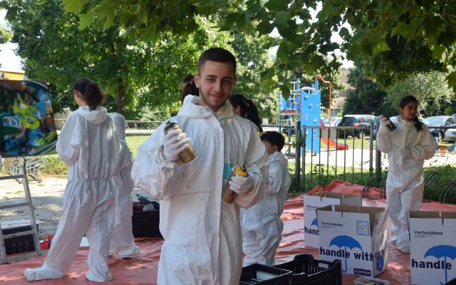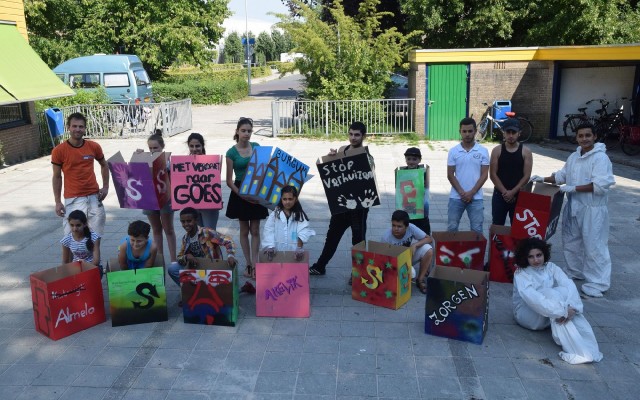 Chris Veldhof begeleidde de kinderen bij het beschilderen van de verhuisdozen.
