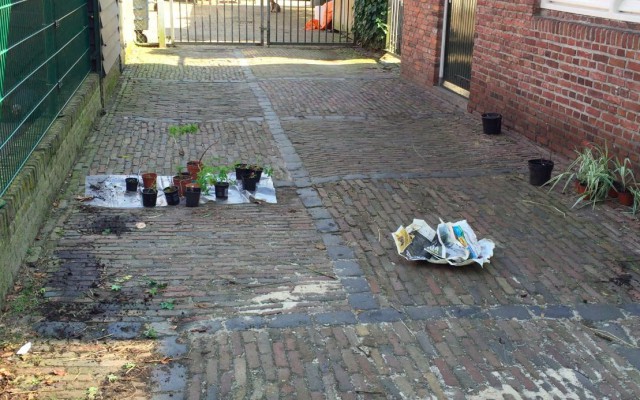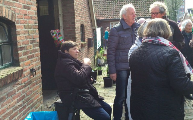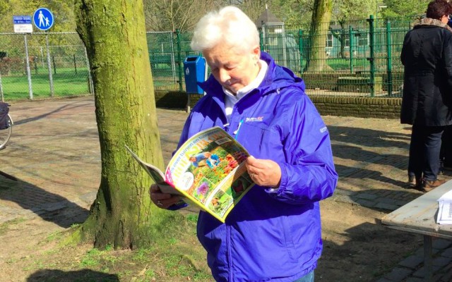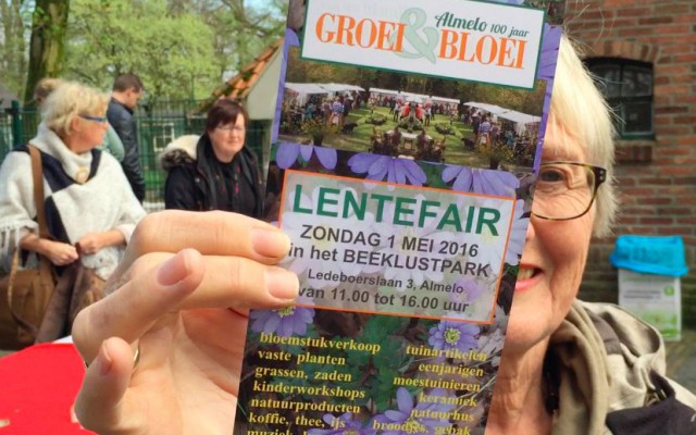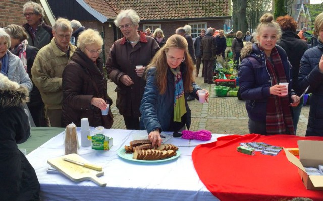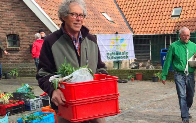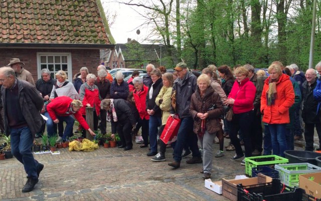 Dat startsein geeft Johan Meenhuis om tien uur. In minder dan een half uur is de plantenvoorraad geslonken tot een honderdste. Een menigte tuinliefhebbers komt er op af. Wanneer de buit binnen is het gezellig koffie drinken bij de informatiestand van Groei & Bloei.