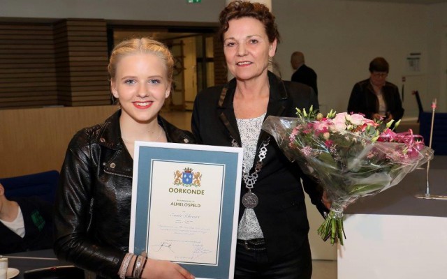 Een stralende Esmée Schreurs kreeg deze week te midden van familie en bekenden door wethouder Anja Timmer de Almelospeld opgespeld.Wethouder Timmer zei heel erg meegeleefd te hebben tijdens de befaamde uitzending waarin Esmée de finale van The Voice Kids won. Ze sprak haar bewondering uit namens de gemeenteraad, die unaniem besloten had om Esmée te eren met de speld. 'Almelo is trots op je'.