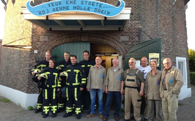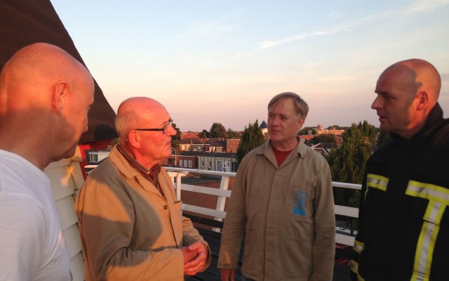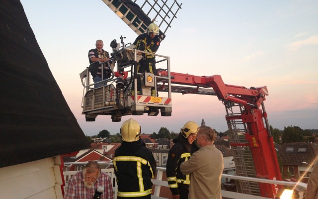 Luister naar de initiatiefnemer van deze oefeningen Jac Nuitermans, molenaar in opleiding, Eddy Blenke, molenaar opleider, 'slachtoffer' Harrie van Workum en bevelvoerder brandweer Almelo, Bert Wiltvank.
