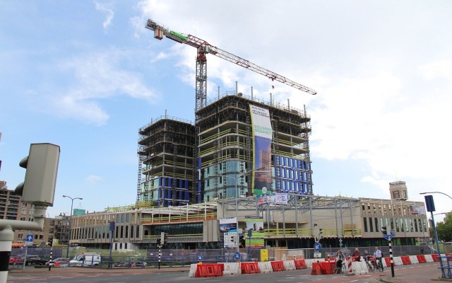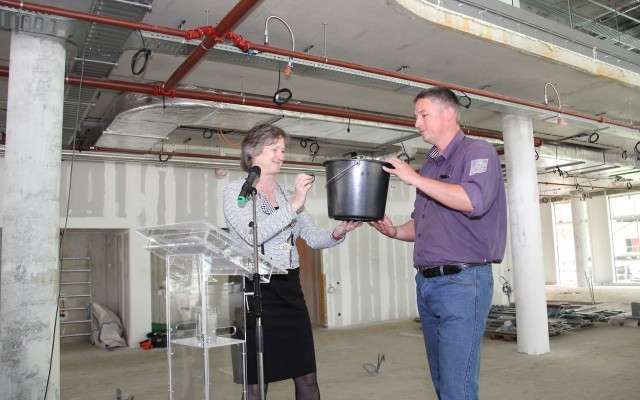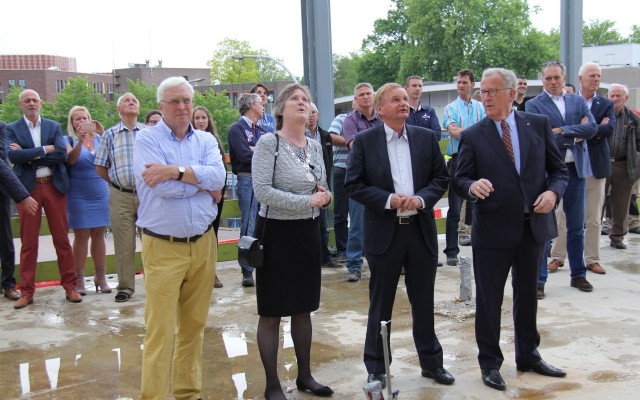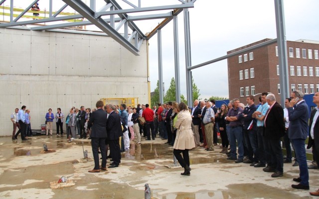 Pannenbier voor de bouwers van het nieuwe stadhuis, want het hoogste punt is bereikt. Ruim tweehonderd mensen woonden het feestje bij en aten traditioneel een gehaktbal.Burgemeester Jon Hermans-Vloedbeld heette hen allen welkom en schetste wat er allemaal bij de bouw kwam kijken tot nu toe.