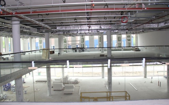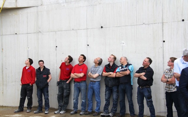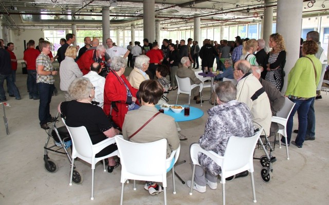 Na de toespraken vertrok het grote gezelschap naar de eerste verdieping om daar te kijken hoe zich een reuze doek van 48 vierkante meters ontrolde met de tekst: 'Bouwers bedankt'.