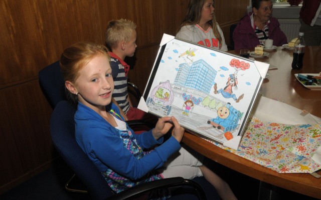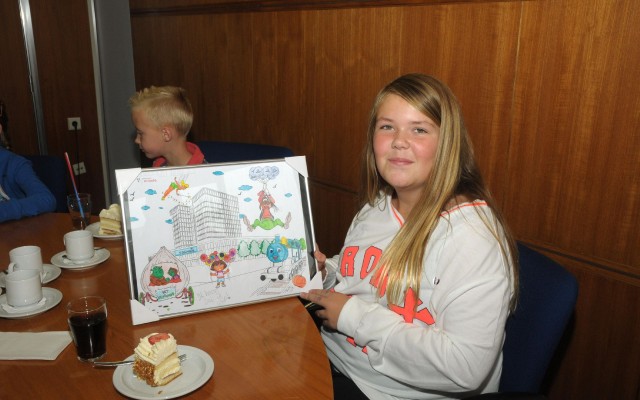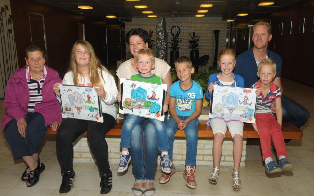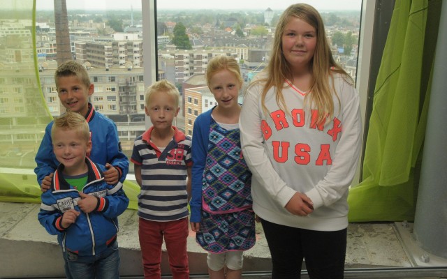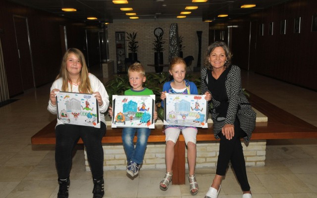 Zij kregen woensdagmiddag van wethouder Timmer een prijs. Twee gratis bioscoopkaartjes en hun eigen kleurplaat mooi ingelijst. Ze werden met begeleiders en broertje of zusje verwelkomd met een groot gebakje in de werkkamer van wethouder Timmer en mochten daarna vanaf de 18e verdieping een kijkje nemen in het nieuwe stadhuis. De tocht naar boven in de bouwlift was al een ervaring op zichzelf.