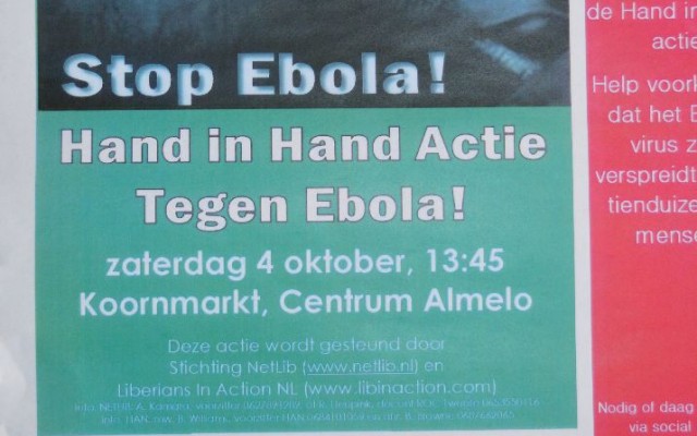 Abdulla Kamara is een Liberiaan die al 20 jaar in Almelo woont. Voor zijn stichting reist hij regelmatig terug. Sinds juni van dit jaar zit hij gedwongen in Almelo omdat de Ebola epidemie het niet toelaat om terug te keren.Daarom organiseert hij op zaterdag 4 oktober om 13.45 uur een hand in hand actie op de Koornmarkt in de stad. In het gesprek verteld hij o.a. wat voor hulp er nodig is. Belangrijkste voor hem is de dat de mensen weten dat het bestaat en wat het gevolg is voor de mensen en hun omgeving die deze ziekte krijgen.