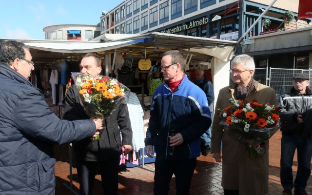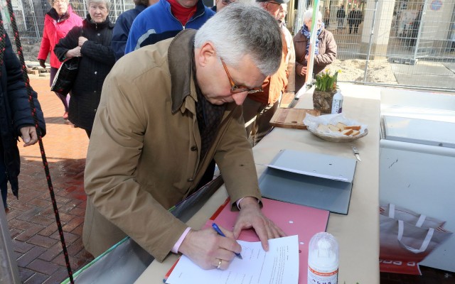 Marco ten Tijhe, Mohammed Hassani en wethouder Jan van Marle zetten iets na twaalven donderdagmiddag hun handtekening onder de overdracht van de markt in handen van de marktkooplui zelf. De paashaas liep rond en deelde eitjes en waardebonnen voor een ijstaart uit. Hoe zien de marktkooplieden de toekomst?Luister naar wethouder van Marle, Marco ten Tijhe, Mohammed Hassani, de paashaas, grand old man Tinus Kuiper, ex-marktmeester René Wolters en Hans Wesselink.