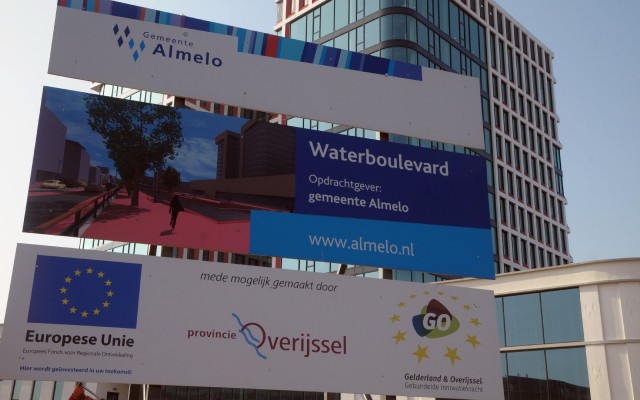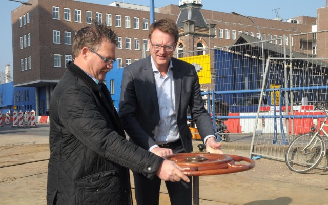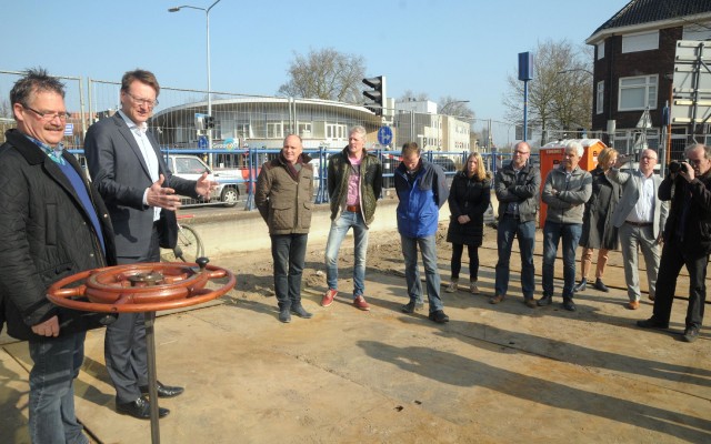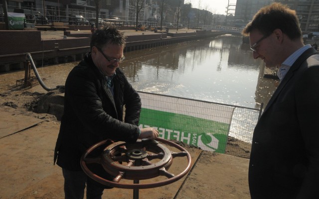 Samen met wethouder Claudio Bruggink draaide Wim Mulder van Van Heteren Weg-en Waterbouw met een authentiek stuurrad de verbinding tussen het water voor het Gerechtshof en het gedeelte voor het nieuwe stadhuis open. Het water stroomde eerst aarzelend, maar daarna op volle kracht door een witte pvc buis met een diameter van 30 cm. Het begin is er, het water is terug in de stad.Luister naar wethouder Claudio Bruggink, directeur Wim Mulder van Van Heteren Weg- en waterbouw naar het verdere verloop van het project.