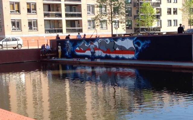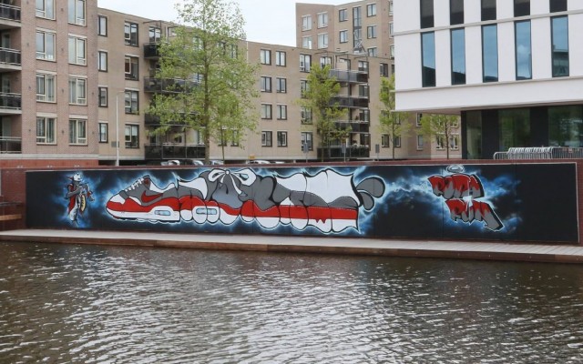 Rapper Noëmar motiveerde de Roparunners op zijn manier: op de wand van de Waterboulevard voor het nieuwe stadhuis spoten hij en zijn collega's een runner en twee enorme sportschoenen.Het was de bedoeling dat de Roparunners er langs zouden lopen, maar ja, de nieuwe brug was nog niet klaar. Des te beter, vanaf afstand er langs rennend nog mooier te bekijken.