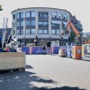 In de binnenstad is de opbouw van het beachvolleybaltoernooi...