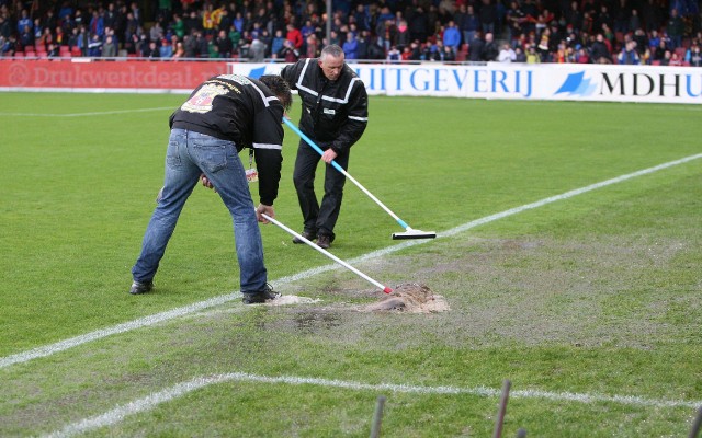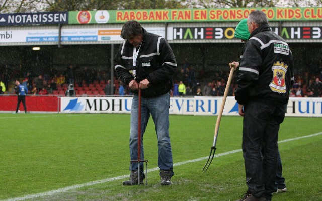 Nadat scheidsrechter Van Sichem de wedstrijd al na twee minuten voor de eerste keer staakte gingen de spelers van Go Aheas en Heracles naar de kleedkamers. Na 20 minuten spelen werd de wedstrijd voor de tweede keer gestaakt en definitief gestopt.De verklaring van Van Sichem : "Het was niet verantwoord om verder te spelen, veel plassen op het veld en de bal rolde niet meer." Heracles trainer Jan de Jonge: "Als je verder gespeeld had had je blessures gekregen." De wedstrijd wordt op een andere dag en tijdstip uitgespeeld.