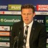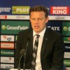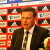 Dit keer een blije trainer John Stegeman na NAC op de persco...