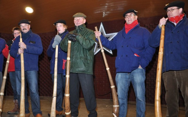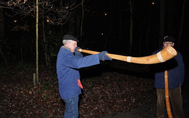 Veel gevraagd zijn ze deze maand, de adventsperiode, de midwinterhoornblazers. Zestien jaar geleden was dat niet gemakkelijk, toen waren ze met z’n drieën. Jan Schelfhorst en de gebroeders Gerard en Johan Braakhuis. De laatsten blazen al vijftig jaar en werden daarvoor gehuldigd met een gouden speld voorafgaand aan het concert zondagmiddag in het Beeklustpark.Tegenwoordig kan met minder moeite aan de vraag voor sfeervolle omlijsting van kerstvieringen van scholen, kerken en verenigingen worden voldaan. Ruim dertig blazers telt de groep momenteel.