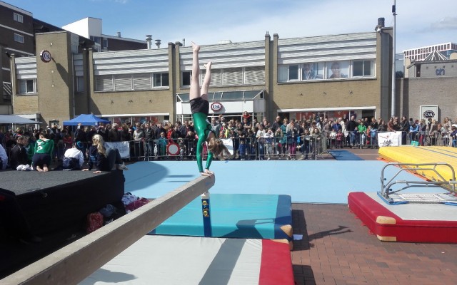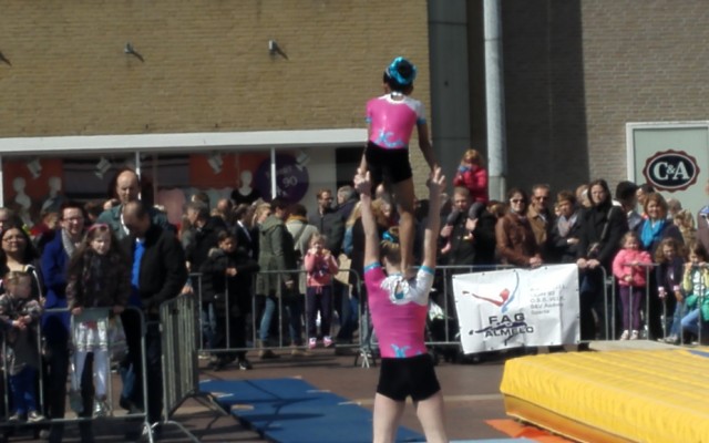 TURNEN - De FAG Almelo (De Federatie van Almelose Gymnastiekver.) gaf op Koningsdag een demonstratie op het Marktplein. Alle disciplines uit de turnsport kwamen aan bod. De vijf Almelose gymverenigingen t.w. Achilles, OSS-WIK, Odin'92, S en V Aadorp en Sparta lieten het beste zien.De belangstelling voor de demonstraties was groot. Om 11.00 uur werd er begonnen. Elk optreden van de verenigingen duurde zo'n vijftig minuten. Ook was er aandacht voor het project "Gym voor 45plus".
