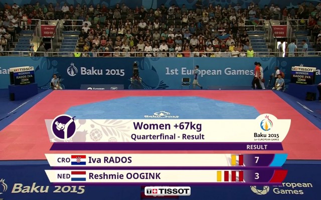 Olympisch hoop voor Almelo Reshmie Oogink is in de kwart-finale van de Europese Spelen in Baku uitgeschakeld. De als nummer twee voor het toernooi gekwalificeerde Taekwondoka uit Almelo moest haar meerdere erkennen in de 19-jarige Iva Rados uit Kroatië. Al vroeg in de eerste ronde kwam Reshmie op een kleine achterstand. Na twee keer over een straf was het punten verschil te groot geworden. In de derde en laatste ronde probeerde ze de achterstand goed te maken met een trap richting het hoofd van haar tegenstander, maar dat mislukte. De wedstrijd eindigde met een 7-3 eindstand.